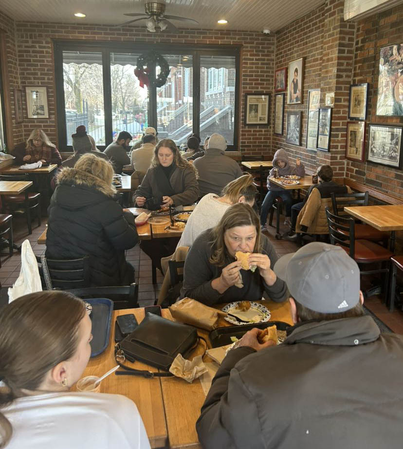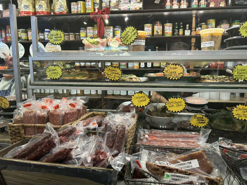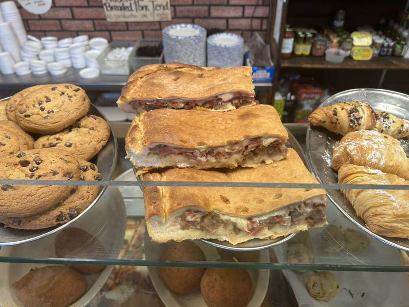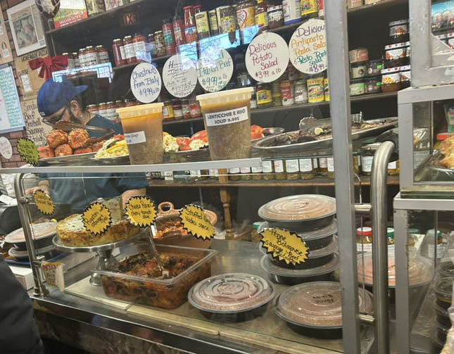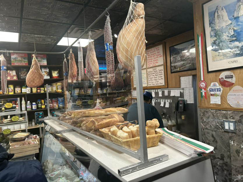 The main building is, quite literally, a grocery store. Inside, you can find a variety of imported olive oils, jarred sauces, and dried pastas. The line for placing food orders winds its way around the edges of the store, passing by shelves and coolers stocked with homemade gnocchi, cavatelli, tortellini, and more. Though the space is tight, it is alive with the sounds of busy employees filling orders. The air is filled with tempting smells of cured meats, fragrant spices, and crusty loaves of bread, making everyone in line eager to place their order.